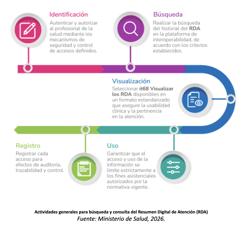 El Resumen Digital de Atención (RDA) estará disponible para los profesionales de la salud durante el proceso de atención de los pacientes. Mediante el Sistema de Información Hospitalario (HIS), los profesionales podrán buscar y consultar el historial de atenciones de manera ágil y segura, accediendo a la información detallada de cada RDA con el fin de respaldar una atención integral y oportuna.