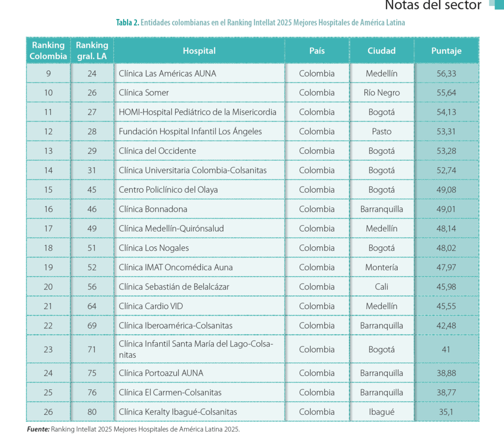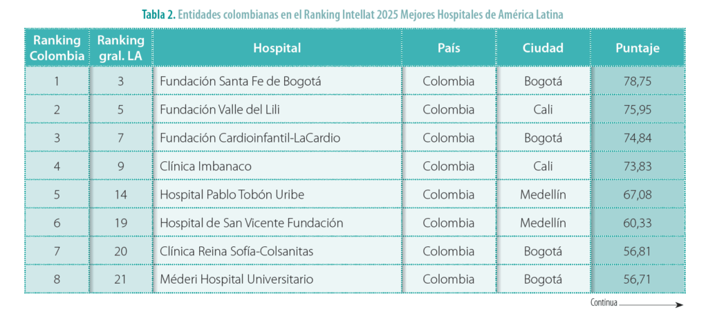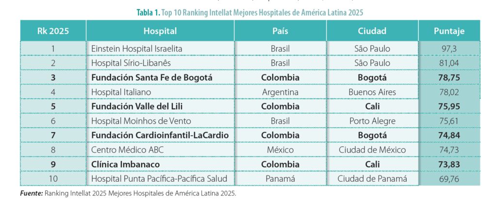 El más reciente Ranking Intellat 2025 de los mejores hospitales y clínicas de América Latina evidenció nuevamente el liderazgo de las instituciones hospitalarias colombianas en la región. En la clasificación general en el top diez del ranking se posicionaron: la Fundación Santa Fe de Bogotá en el tercer lugar en América Latina, con 78,75 puntos, solo superada por dos hospitales brasileños (Hospital Israelita Albert Einstein y el Hospital Sírio-Libanês). Por su parte, la Fundación Valle del Lili de Cali se ubicó en el quinto puesto con 75,95 puntos; la Fundación Cardioinfantil-LaCardio de Bogotá en el séptimo con un puntaje de 74,84 y la Clínica Imbanaco de Cali en el noveno lugar con 73,83 puntos sobre cien (tabla 1).